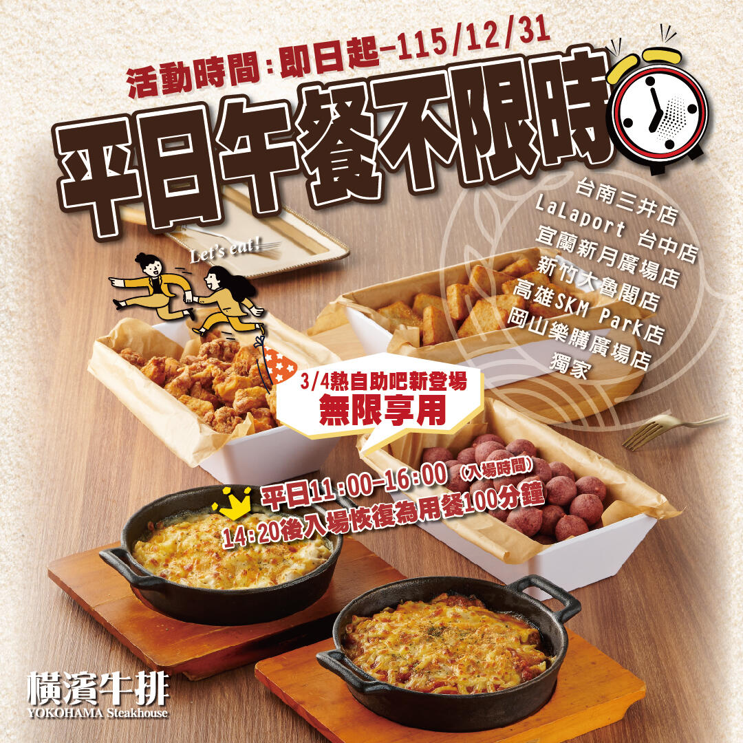 橫濱牛排為日本雲雀餐飲集團旗下品牌,來自日本的專業牛排。以半自助吧Semi Buffet方式,提供炙熱燒烤專業牛排、手作漢堡排、精緻排餐、義大利麵、飯,以及繽紛多樣健康的自助吧,結合健康/休閒/豐富的概念,帶給顧客全新味覺饗宴!點主餐即能享用沙拉、飯、咖哩、湯、甜點、霜淇淋、飲料無限吃到飽,十足滿足!